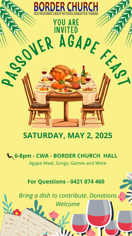 In the evening. at 6pm, we will be holding a Passover Agape meal at the QCWA Hall. All are invited to attend and join us for this time of fellowship. Bring a dish to share and a heart to sing.